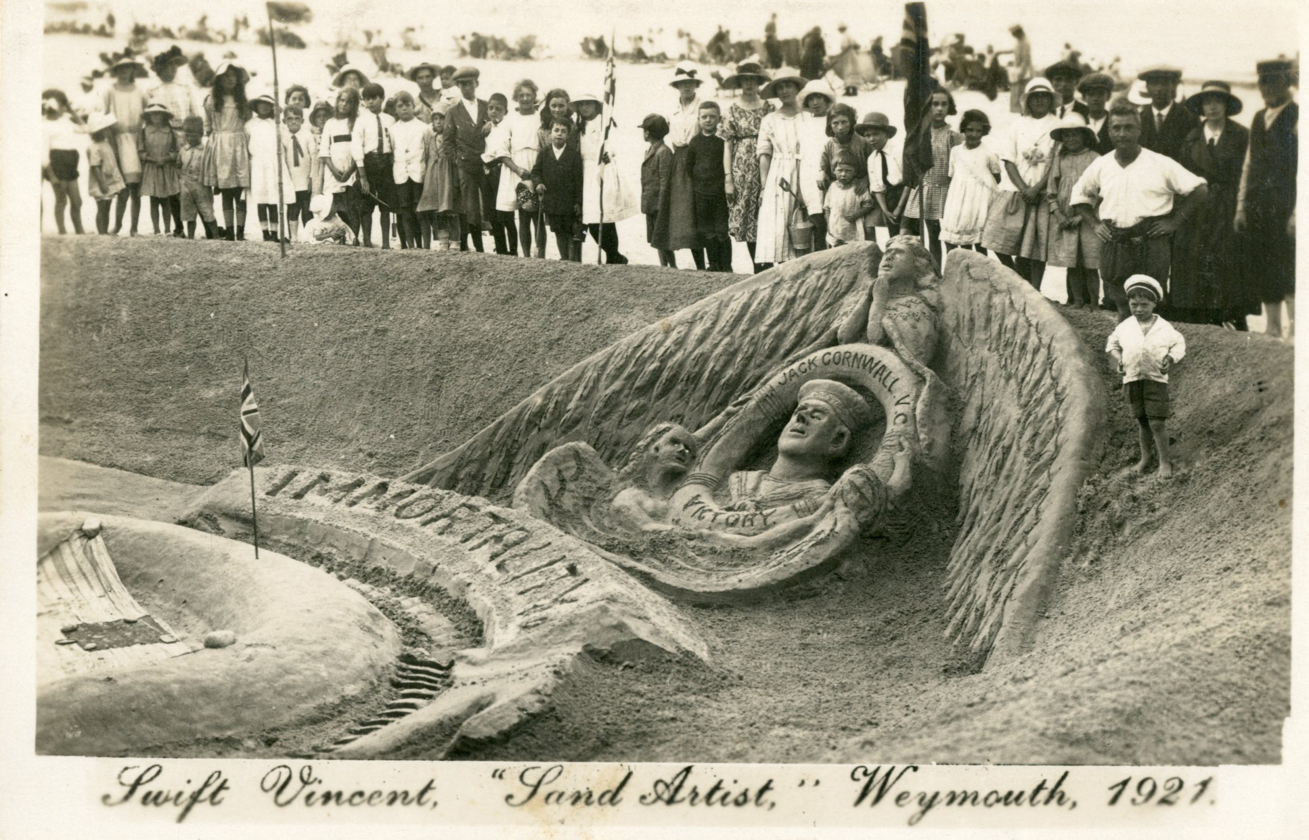 This picture shows a wonderfully elaborate sand sculpture at Weymouth commemorating Jack Cornwell, V.C., although the inscription reads “Cornwall.”